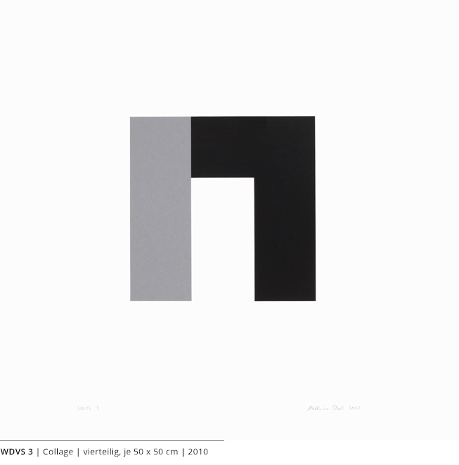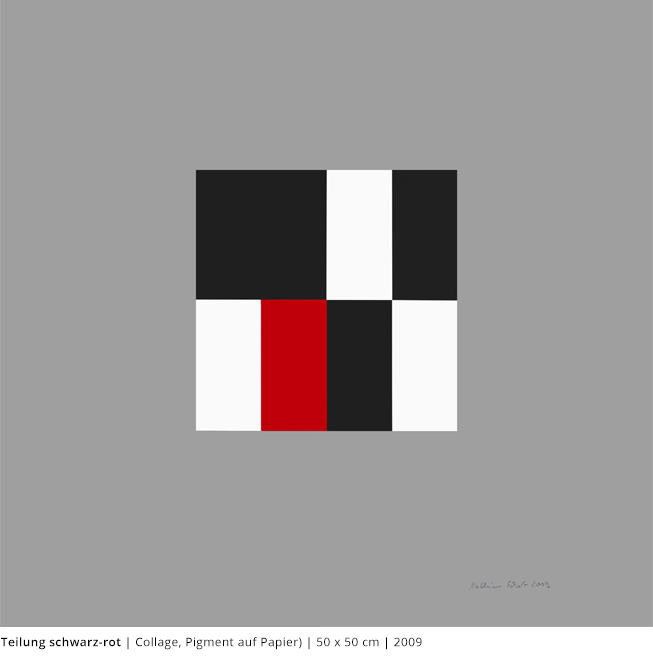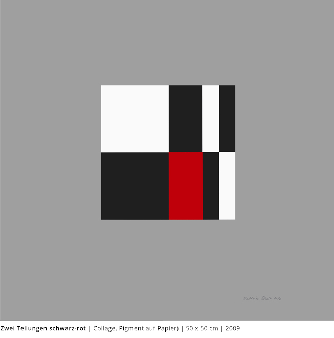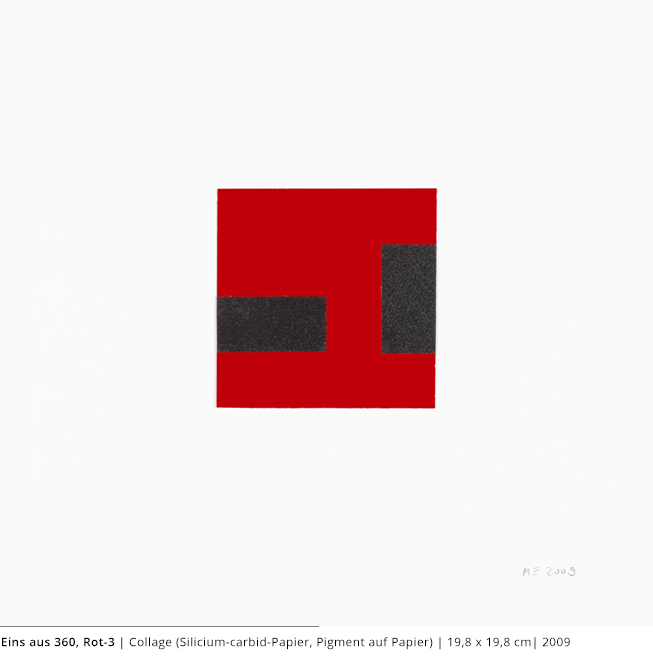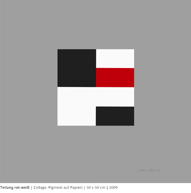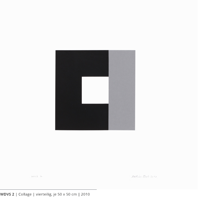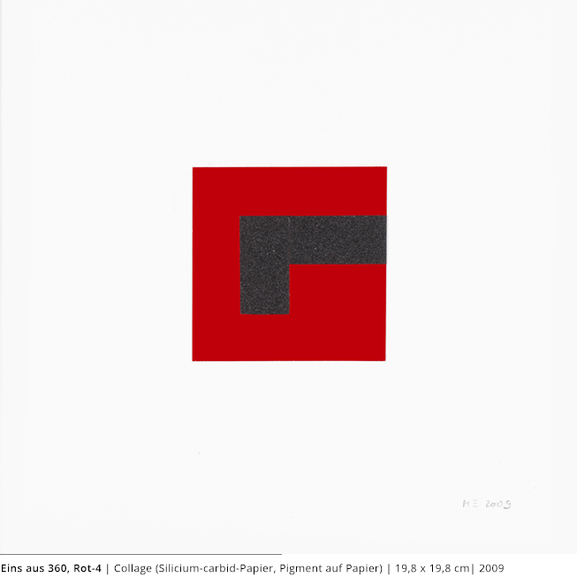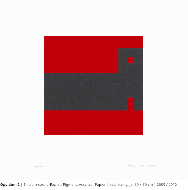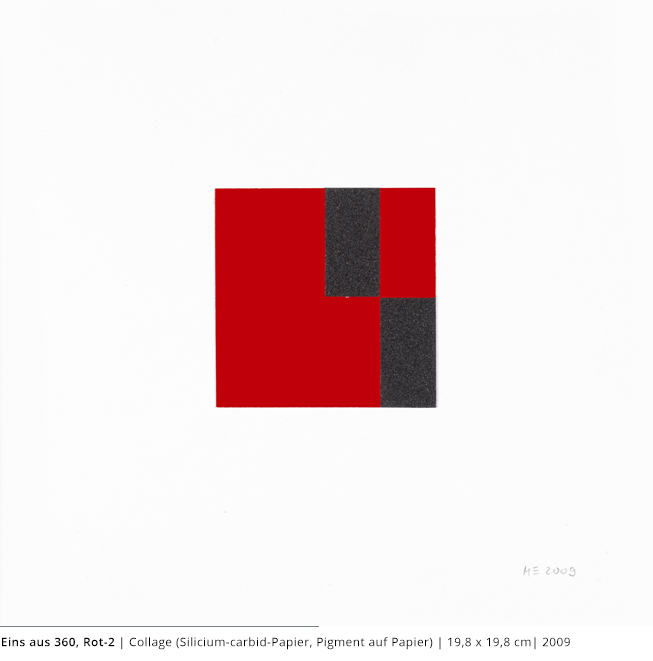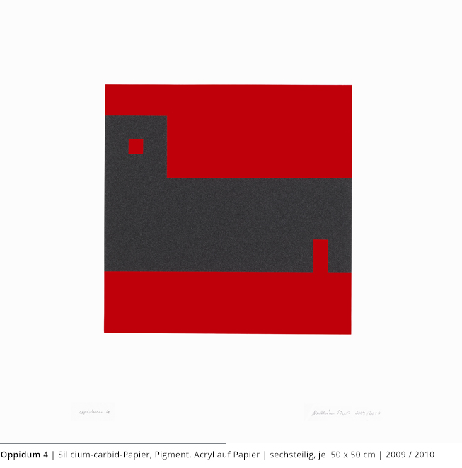Bei den Arbeiten auf Papier wird die rein zweidimensionale, nicht gekrümmte Fläche bearbeitet. Als abgeschlossene Bildebenen zeigen sie das Zusammenspiel von Linien, Flächen und Farben und stehen nur für sich.