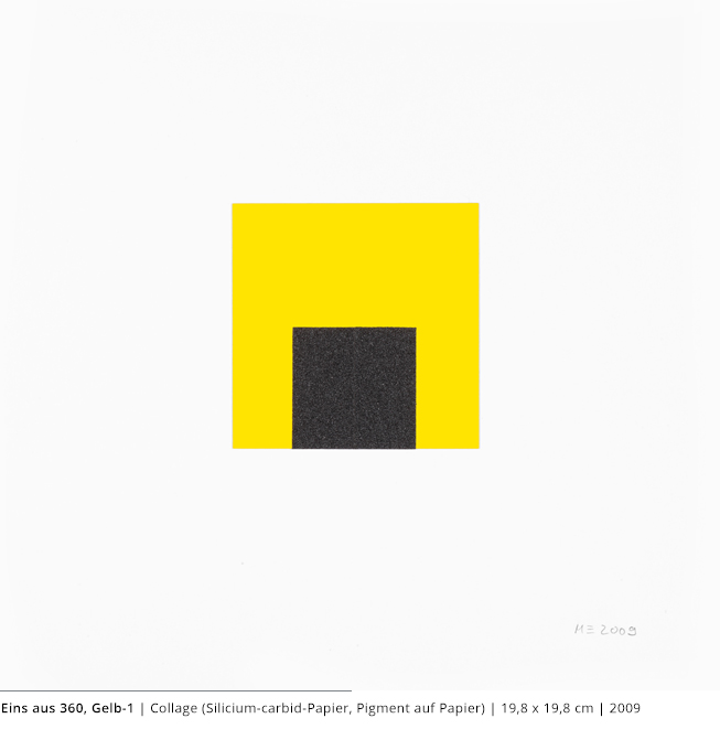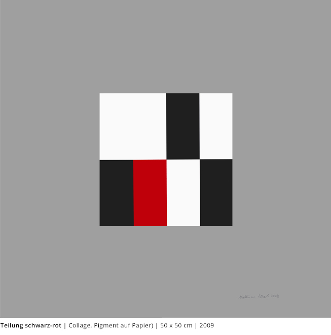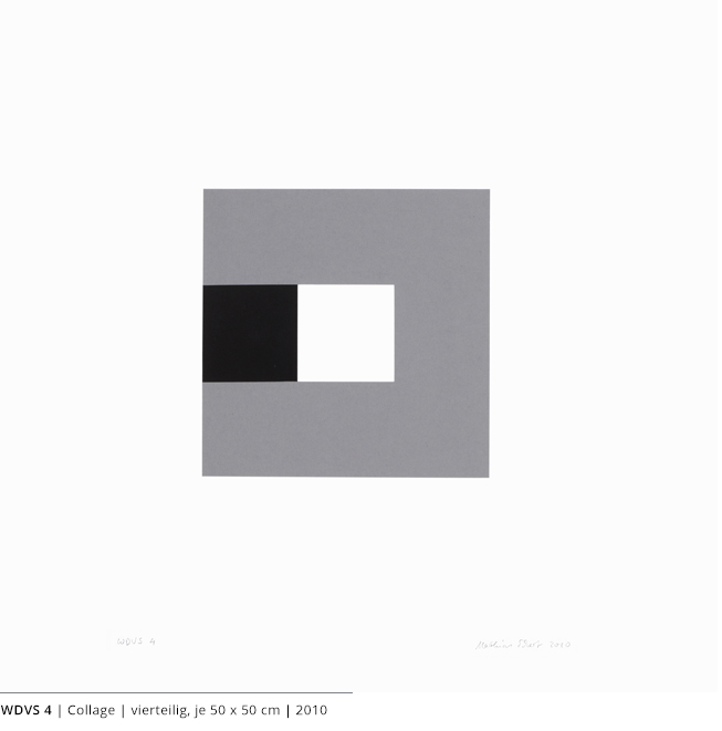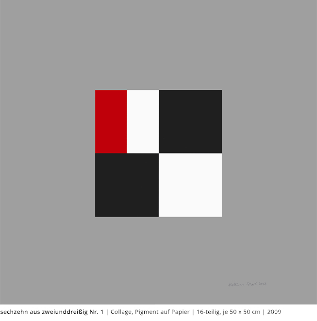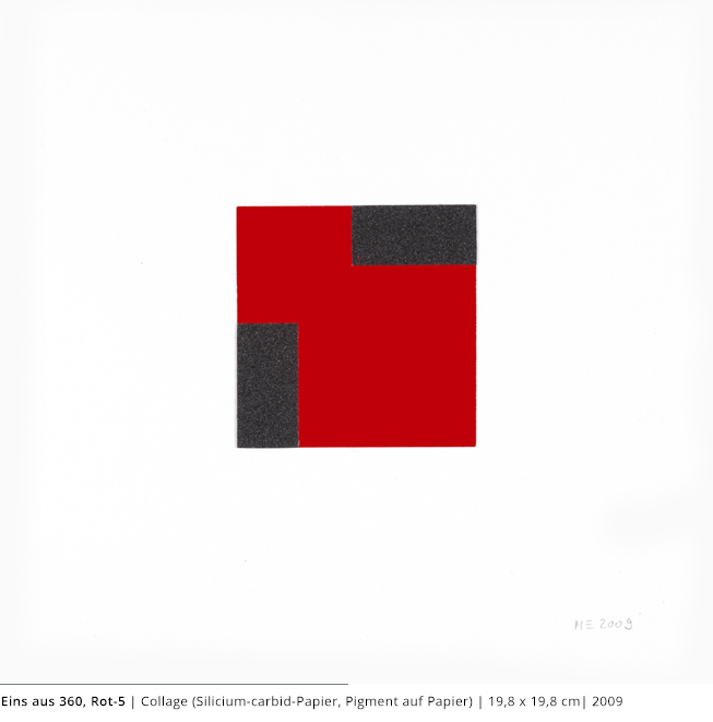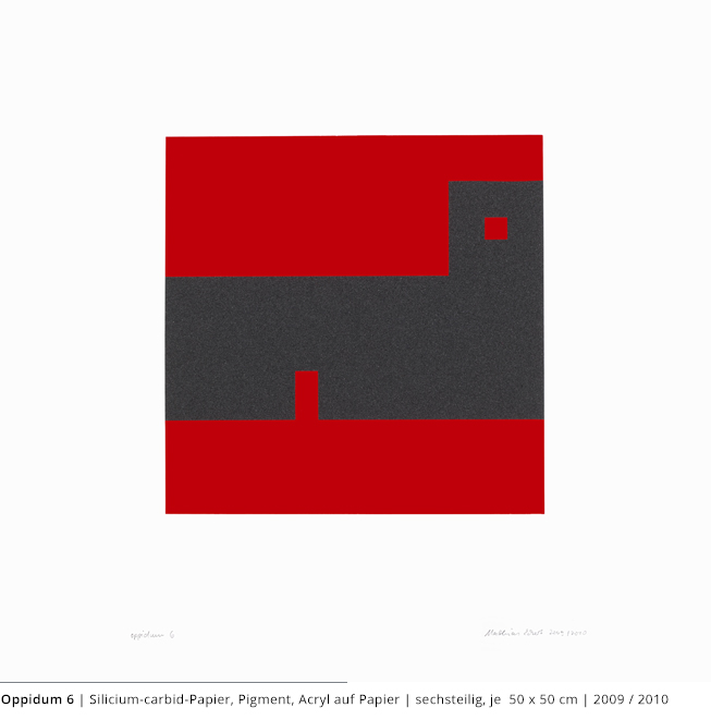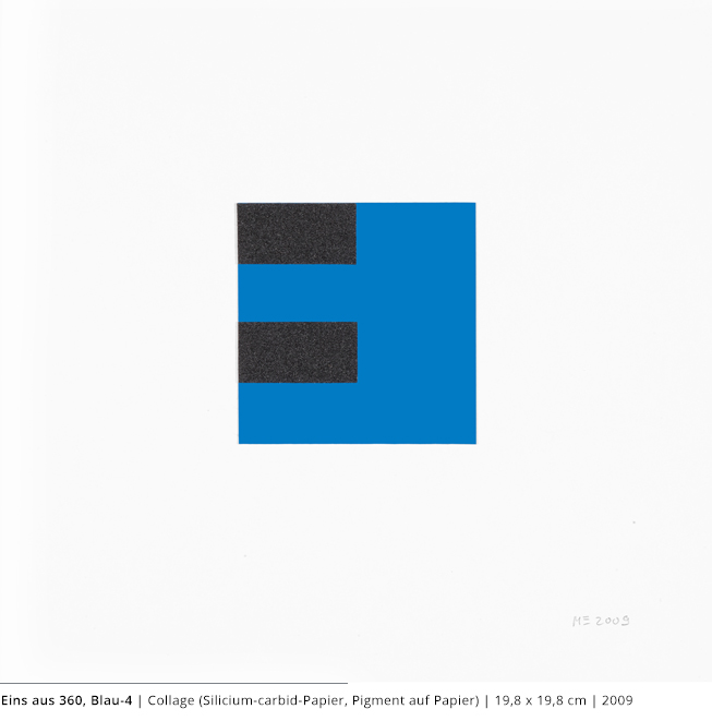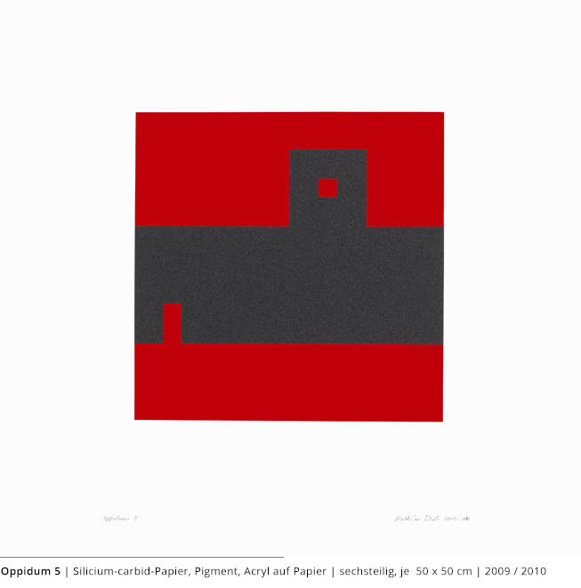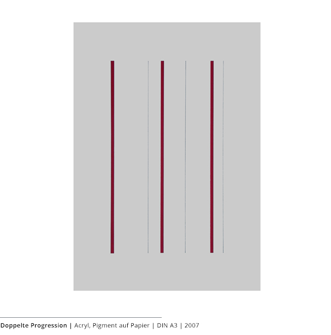 Bei den Arbeiten auf Papier wird die rein zweidimensionale, nicht gekrümmte Fläche bearbeitet. Als abgeschlossene Bildebenen zeigen sie das Zusammenspiel von Linien, Flächen und Farben und stehen nur für sich.